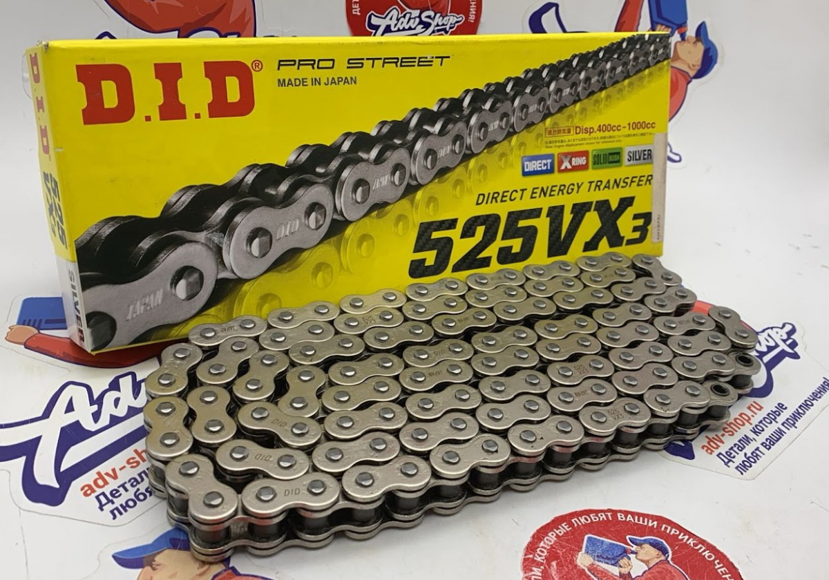 DID 525 VX3 SS 122 звена / серебро (замок заклепка в комплекте) XRV750 90-03 / CRF1000 16-20
